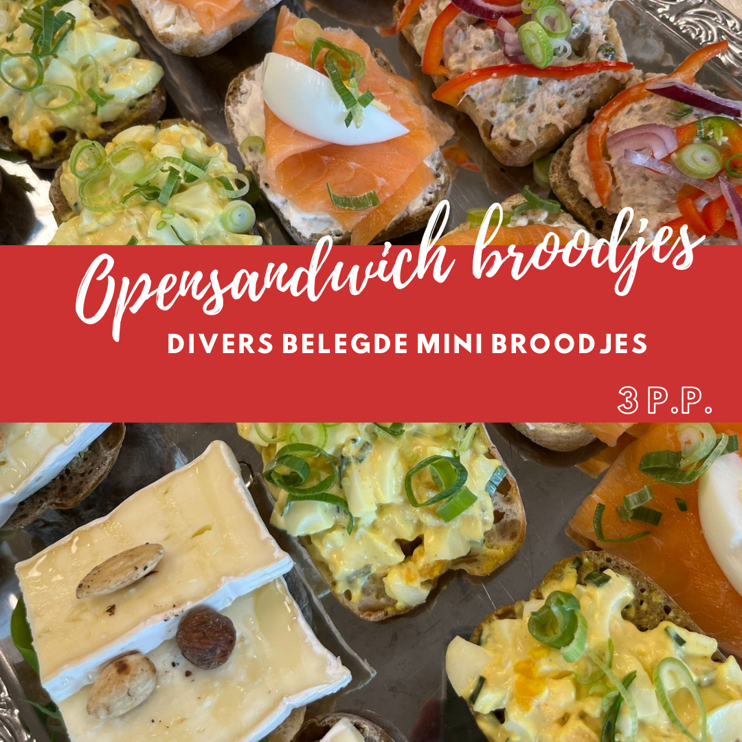 Kleine belegde broodjes met luxe beleg zoals oude kaas met pesto, eiersalade, brie, roomkaas met tomaat, tonijnsalade en gerookte zalm.